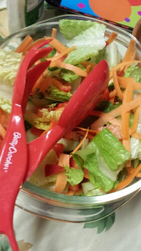 While my pizza baked for another 8-10 minutes, I threw together a simple salad with romaine lettuce, grated carrots, and chopped red peppers and cucumbers. I needed a little something to munch on along with my ‘za!