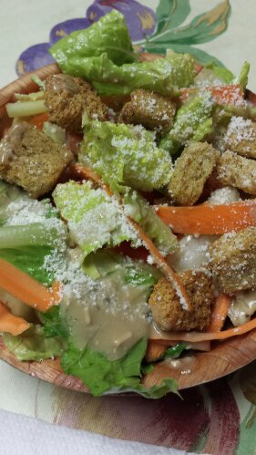 I chose to personally make mine into a Caesar salad, and so I added a bit of the extra parmesan cheese, some croutons and Caesar vinaigrette!