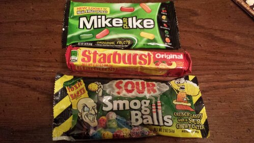Now onto the sugary and sour candies: there’s a bag of Mike & Ikes, Sour Smog Balls (kinda like Warheads) and Starbursts!
