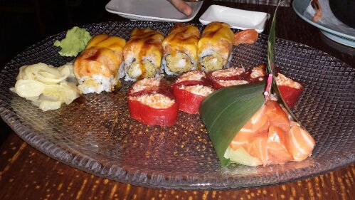 Friday night was Date Night! K and I went to Harusaki and got an amazing array of sushi. We started out with 22 oz. Sapporo Beers and each chose a soup: mine miso, and his seafood! Then we waited patiently for our sushi to arrive.. and not only did it taste delicious but it looked pretty too! I got a “Love Roll” which was fresh raw tuna wrapped around spicy crunchy crabmeat (no rice) and it came with a fresh salmon sashimi and pineapple salad. K got a fried roll consisting of fried lobster in the middle, covered in rice, mango and yellowtail!